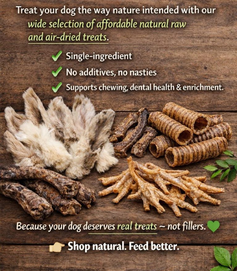 From air-dried chews to gently prepared snacks, every bite is packed with real flavour and goodness your pets will love — because treating them well starts with keeping it natural.